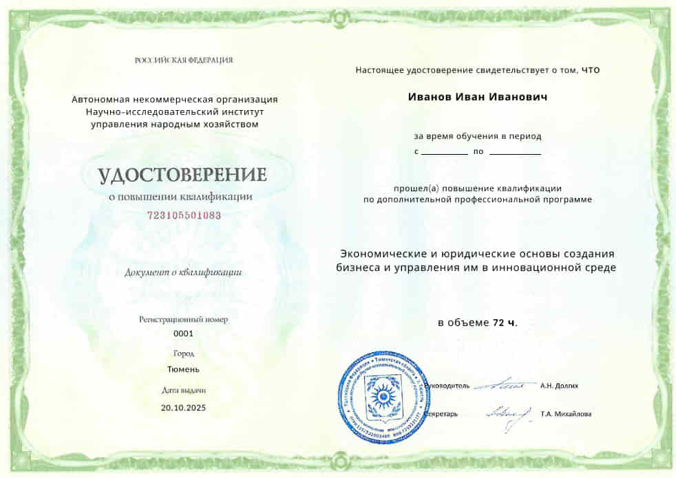 Пройдите обучение по востребованной профессии по специальности «Экономические и юридические основы создания бизнеса и управления им в инновационной среде» обучаясь на курсах повышения квалификации и профессиональной переподготовки под руководством одних из лучших преподавателей в отрасли.