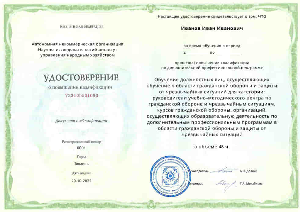 Совершенствование компетенций и повышение профессионального уровня в области гражданской обороны и защиты от чрезвычайных ситуаций для категории: руководители учебно-методического центра.