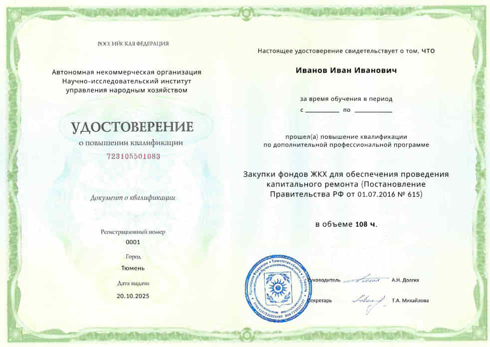Программа «Закупки фондов ЖКХ для обеспечения проведения капитального ремонта (Постановление Правительства РФ от 01.07.2016 № 615)» разработана в целях осуществления единой государственной политики в области профессиональной подготовки специалистов по осуществлению закупок для фонда ЖКХ для обеспечения капитального ремонта.