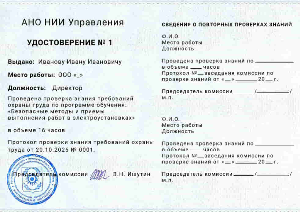 АНО НИИ Управления проводит обучение по программе «Обучение безопасным методам и приемам выполнения работ повышенной опасности, к которым предъявляются дополнительные требования в соответствии с нормативными правовыми актами, содержащими государственные нормативные требования охраны труда (Безопасные методы и приемы выполнения работ в электроустановках)» в соответствии с Постановлением Правительства РФ от 24.12.2021 № 2464 «О порядке обучения по охране труда и проверки знания требований охраны труда». Обучающиеся получат знания и умения от квалифицированных преподавателей в данной сфере.