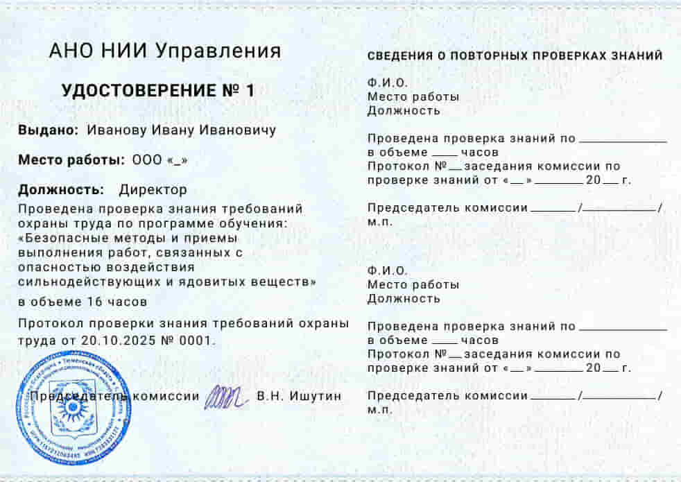 АНО НИИ Управления проводит обучение по программе «Обучение безопасным методам и приемам выполнения работ повышенной опасности, к которым предъявляются дополнительные требования в соответствии с нормативными правовыми актами, содержащими государственные нормативные требования охраны труда (Безопасные методы и приемы выполнения работ, связанных с опасностью воздействия сильнодействующих и ядовитых веществ)» в соответствии с Постановлением Правительства РФ от 24.12.2021 № 2464 «О порядке обучения по охране труда и проверки знания требований охраны труда». Обучающиеся получат знания и умения от квалифицированных преподавателей в данной сфере.