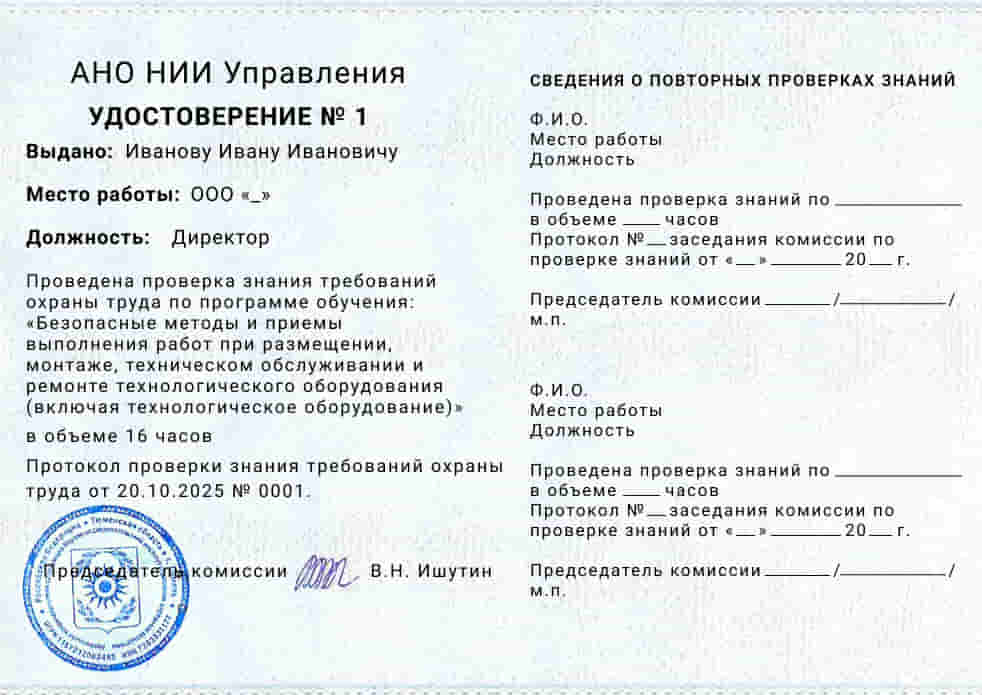 АНО НИИ Управления проводит обучение по программе «Обучение безопасным методам и приемам выполнения работ повышенной опасности, к которым предъявляются дополнительные требования в соответствии с нормативными правовыми актами, содержащими государственные нормативные требования охраны труда (Безопасные методы и приемы выполнения работ при размещении, монтаже, техническом обслуживании и ремонте технологического оборудования (включая технологическое оборудование))» в соответствии с Постановлением Правительства РФ от 24.12.2021 № 2464 «О порядке обучения по охране труда и проверки знания требований охраны труда». Обучающиеся получат знания и умения от квалифицированных преподавателей в данной сфере.