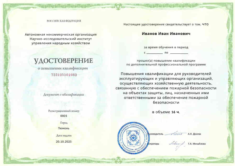Пройдите обучение по востребованной программе «Повышения квалификации для руководителей эксплуатирующих и управляющих организаций, осуществляющих хозяйственную деятельность, связанную с обеспечением пожарной безопасности на объектах защиты, лиц, назначенных ими ответственными за обеспечение пожарной безопасности», обучаясь на курсах повышения квалификации в Институте пожарной безопасности под руководством одних из лучших преподавателей в отрасли.