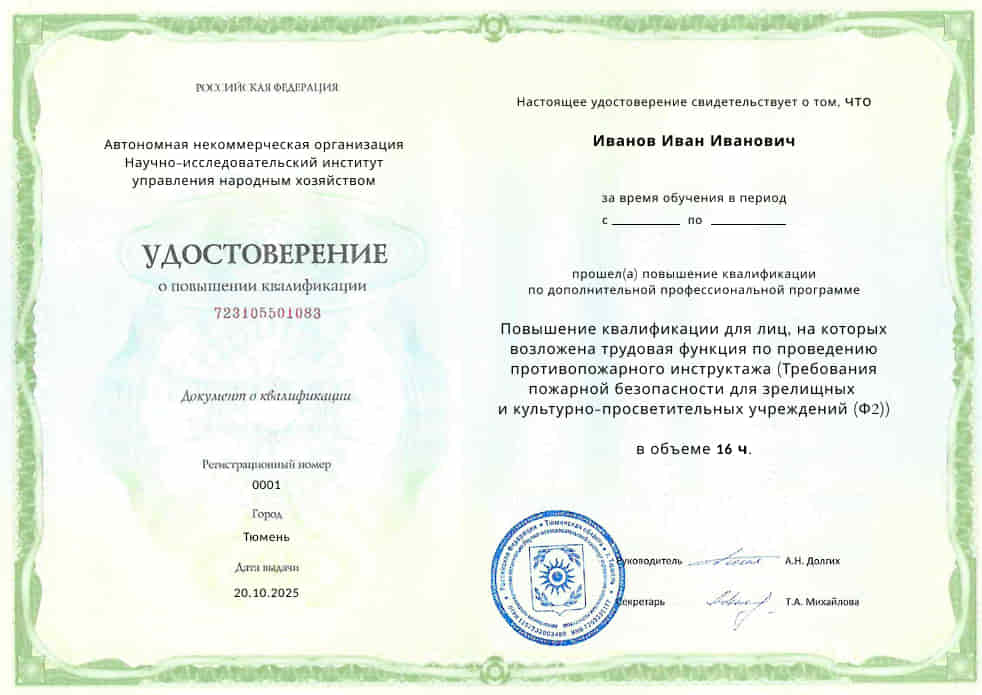 Пройдите обучение по востребованной программе «Повышения квалификации для лиц, на которых возложена трудовая функция по проведению противопожарного инструктажа (Требования пожарной безопасности для зрелищных и культурно-просветительных учреждений (Ф2))», обучаясь на курсах повышения квалификации в Институте пожарной безопасности под руководством одних из лучших преподавателей в отрасли.
