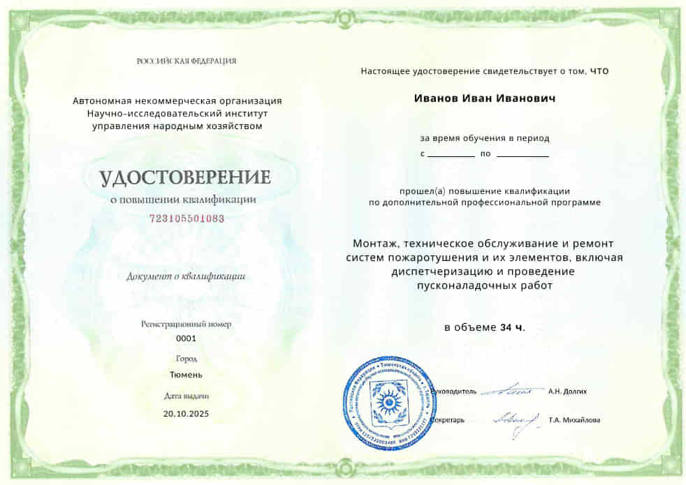 Повышение квалификации специалистов, осуществляющих деятельность по монтажу, техническому обслуживанию и ремонту, в том числе диспетчеризацию и проведению пусконаладочных работ систем пожаротушения, пожарной сигнализации, оповещения и эвакуации при пожаре, в том числе фотолюминесцентных эвакуационных систем, дымоудаления и противодымной вентиляции, противопожарного водоснабжения, передачи извещений о пожаре, противопожарных занавесов и завес, заполнений проемов в противопожарных преградах, и их элементов, в том числе проведение огнезащитной обработки материалов, изделий и конструкций, а также первичных средств пожаротушения.