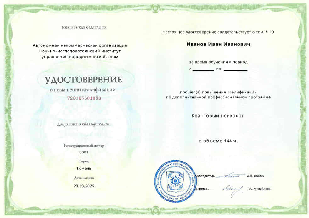 Пройдите обучение по востребованной профессии по специальности «Квантовый психолог», обучаясь на курсах повышения квалификации и профессиональной переподготовки в Институте психологии АНО НИИ Управления под руководством одних из лучших преподавателей в отрасли.