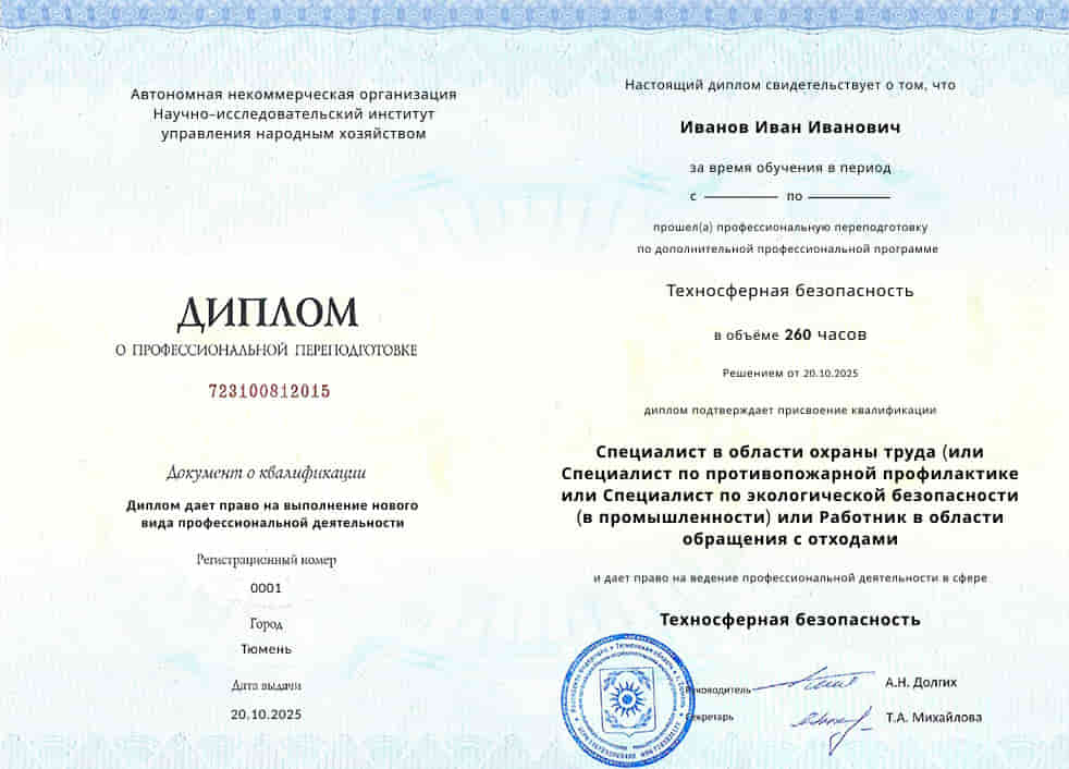 Институт охраны труда АНО НИИ Управления проводит профессиональную переподготовку по программе «Техносферная безопасность» с присвоением квалификации «Специалист в области охраны труда».