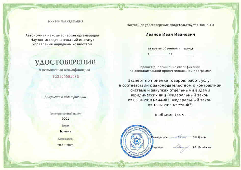 Программа «Эксперт по приемке товаров, работ, услуг в соответствии с законодательством о контрактной системе и закупках отдельными видами юридических лиц (Федеральный закон от 05.04.2013 № 44-ФЗ, Федеральный закон от 18.07.2011 № 223-ФЗ)» разработана в целях осуществления единой государственной политики в области профессиональной подготовки специалистов по управлению, размещению, исполнению и обеспечению государственных заказов.