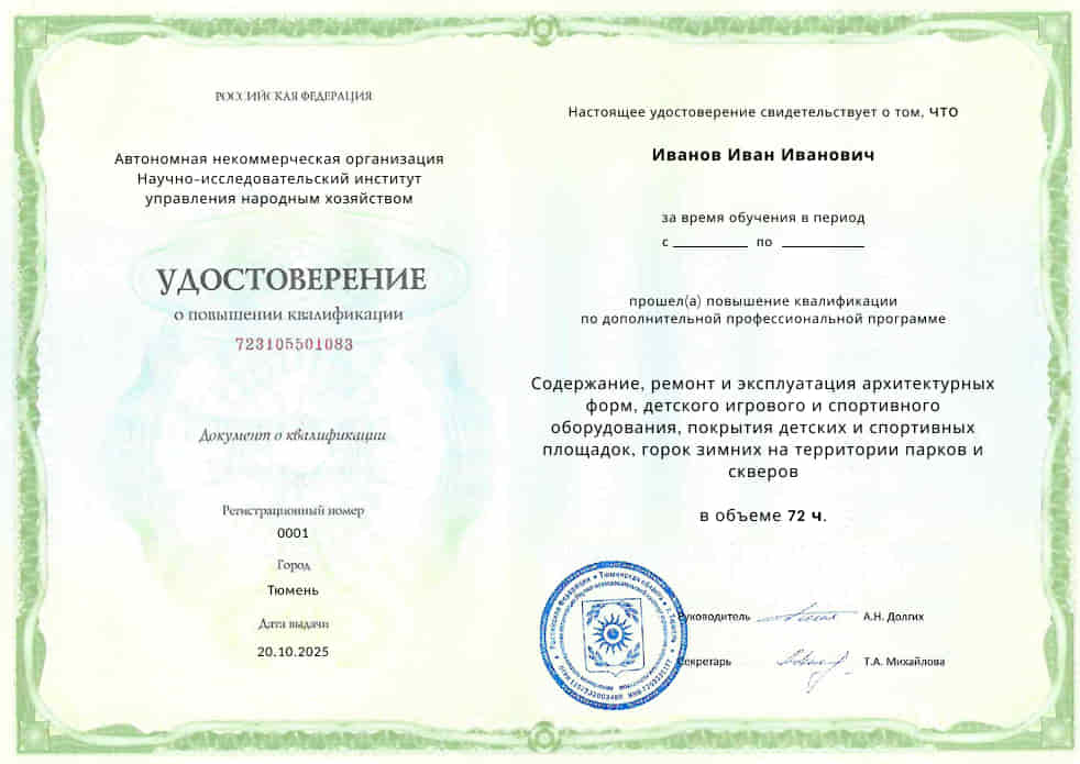 Пройдите обучение по программе «Содержание, ремонт и эксплуатация архитектурных форм, детского игрового и спортивного оборудования, покрытия детских и спортивных площадок, горок зимних на территории парков и скверов» обучаясь на курсах повышения квалификации в Институте государственных закупок под руководством одних из лучших преподавателей в отрасли.